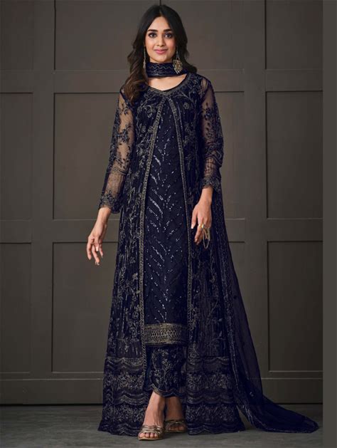 Navy Blue Net Wedding Indian Pakistani Long Gown Anarkali Suit Semi Stitched - Anarkali-Salwar-Kameez
