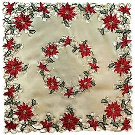 Doily Boutique Christmas Tablecloth Or Table Topper Square Embroidered With Red Poinsettias, 34 Inches